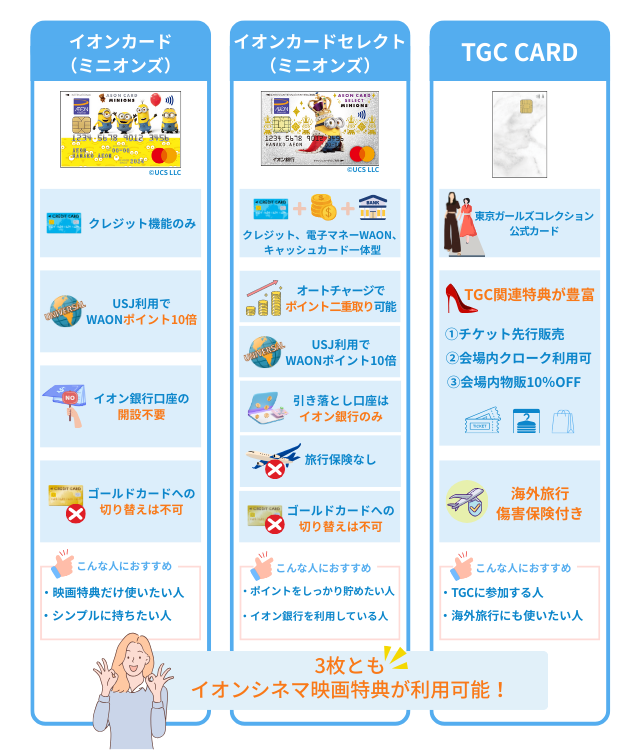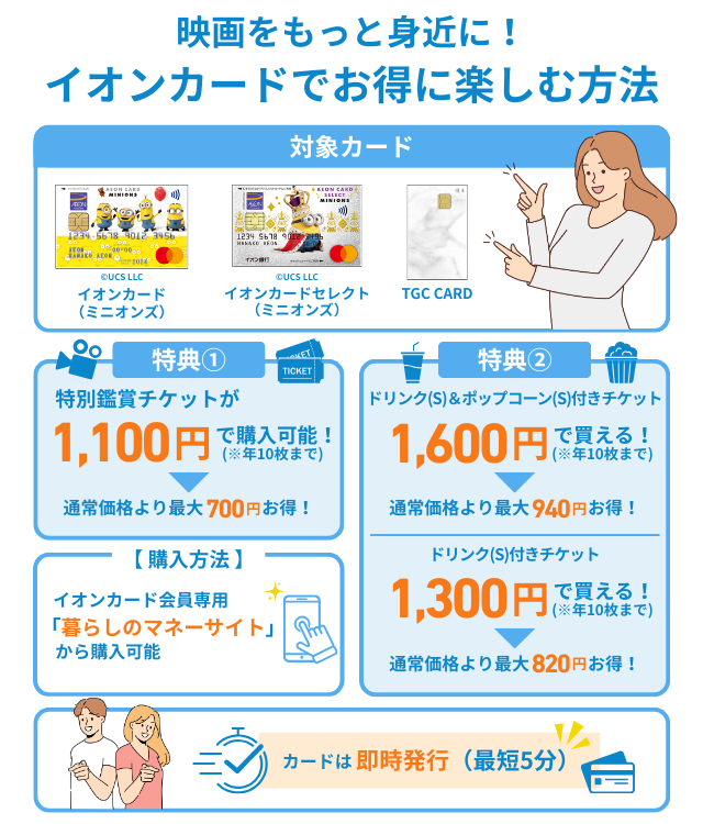 映画鑑賞の割引特典がついている、対象クレジットカードは「イオンカード(ミニオンズ)」「イオンカードセレクト(ミニオンズ)」「TGC CARD」の3種類だ。
