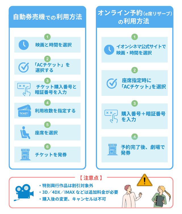 | ① イオンシネマのWebサイトで映画と時間を選択する ② 座席指定時にACチケット情報を登録する ③ チケット購入番号と暗証番号を入力する ④ 予約完了後、劇場で発券する |