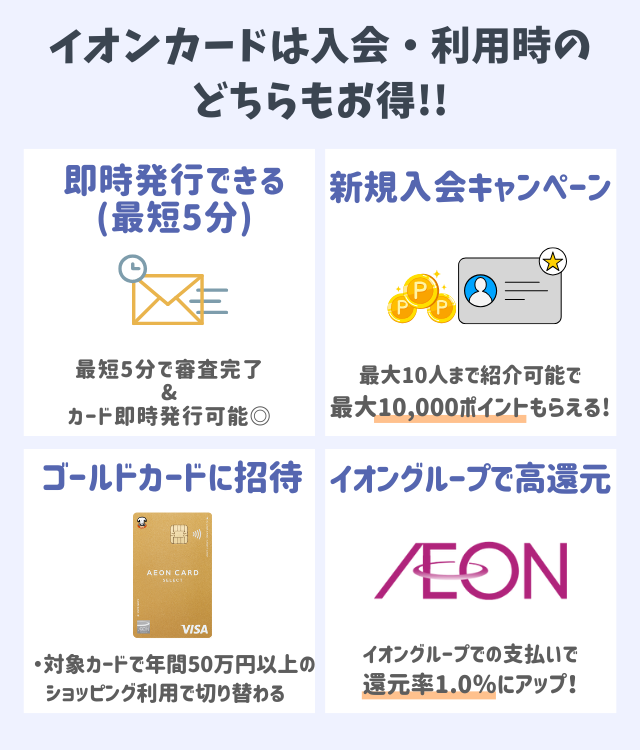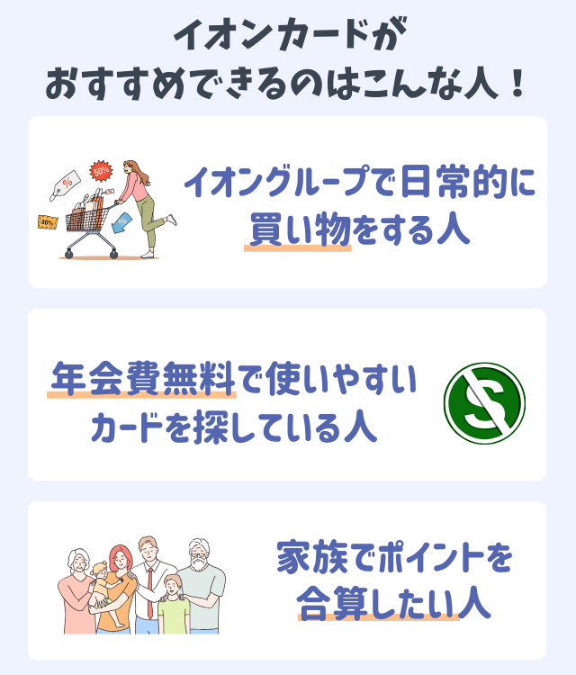 イオンカードは、日常的にイオングループ内で買い物をしたい人、年会費無料で使いやすくゴールドカードも考えている人、家族で貯まったポイントを合算して使いたい人におすすめだ。