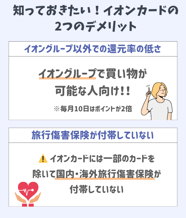 よって旅行中に怪我や事故に遭うと補償の対象とならない。ただし、イオンゴールドカードはもちろん、イオンSuicaカードやKNTカードにはそれぞれ旅行傷害保険が付帯している。
