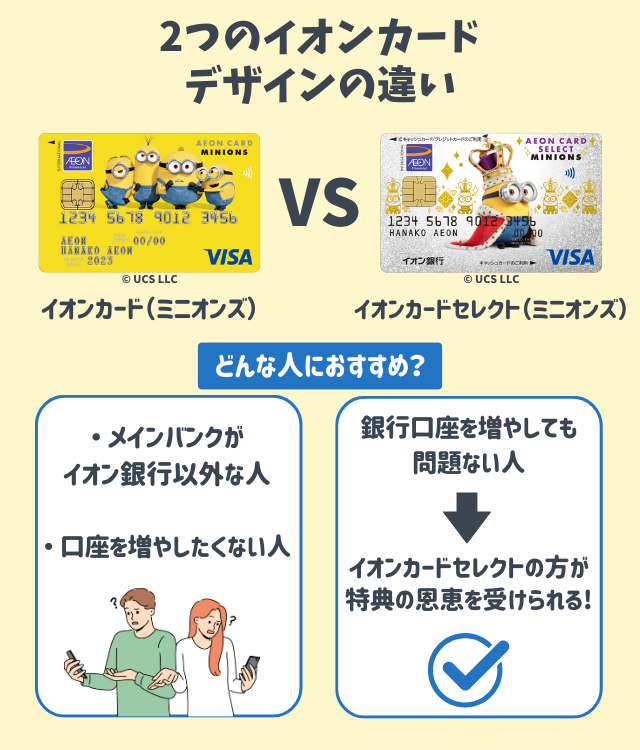 ミニオンズデザインのイオンカードには、イオンカードとイオンカードセレクトの2種類がある。