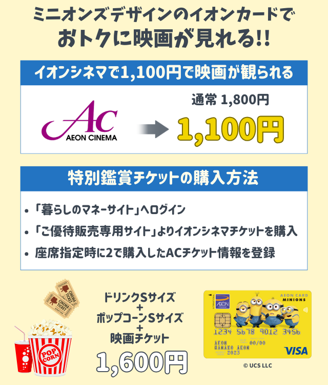 ミニオンズデザインのイオンカードを持っていれば特別鑑賞チケットによっていつでも1,100円でイオンシネマの映画を観ることができる。
