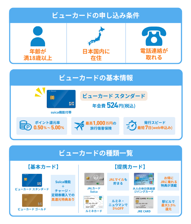 はじめに、ビューカードの申し込み条件や基本情報、種類について紹介する。