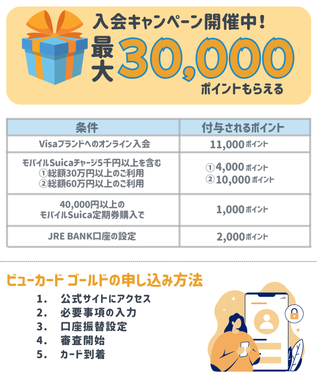 ビューカード ゴールドは、新規入会&条件達成で最大30,000ポイントがもらえるキャンペーンを実施している。