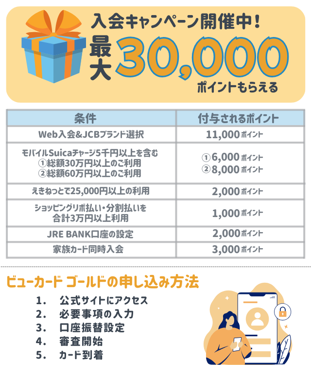 ビューカード ゴールドは、JCBブランドの新規入会&条件達成で最大30,000ポイントがもらえるキャンペーンを実施している。