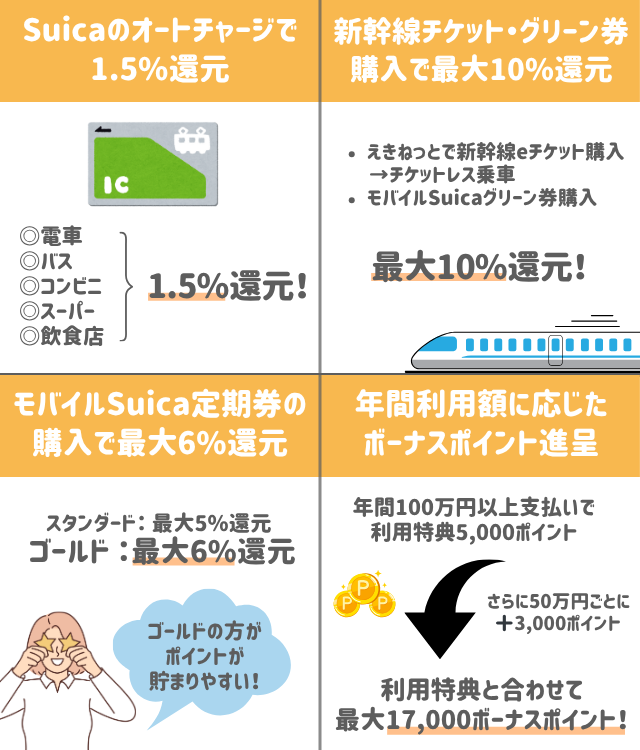 例を挙げると、新幹線チケットやモバイルSuica定期券購入で高還元、ビューゴールドラウンジを利用可能などの特典がある。