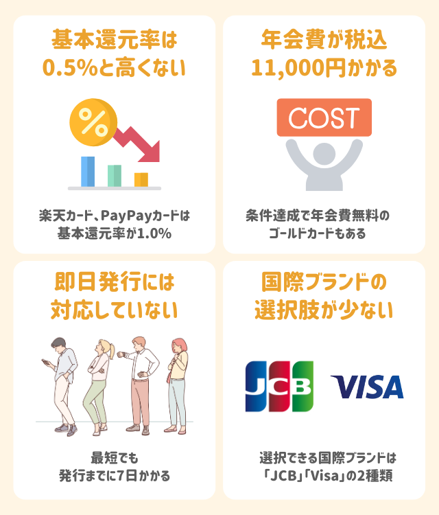一方、基本還元率の低さや年会費が11,000円(税込)かかるデメリットには注意が必要だ。