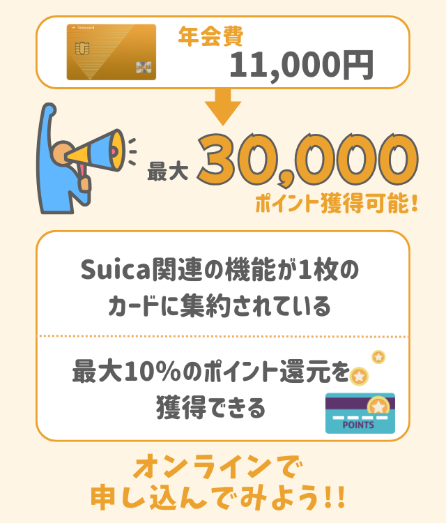 ポイント獲得だけでなく、「Suica関連の機能が1枚のカードに集約されている」「最大10%のポイント還元を獲得できる」などのメリットもあるので、年会費以上のポイントを獲得するのは難しくない。