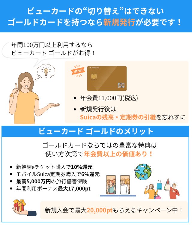 現在ビューカードを所持している人の中には、上位ランクの「ゴールド」に切り替えたいと考えている人も多いだろう。