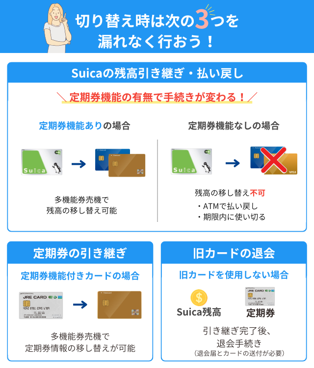 また、切り替え時は新規発行が必要となる。Suica残高、定期券の引き継ぎや支払い設定の変更は忘れず実施しよう。