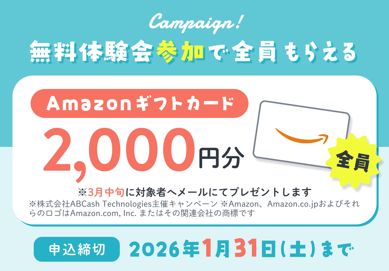 ●Amazonギフトカード対象者には2026年3月15日までに、体験会お申し込み時に入力いただいたメールアドレス宛にAmazonギフトカード番号をお知らせさせていただきます。